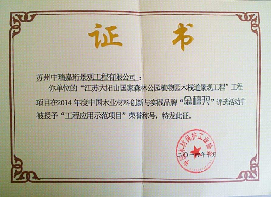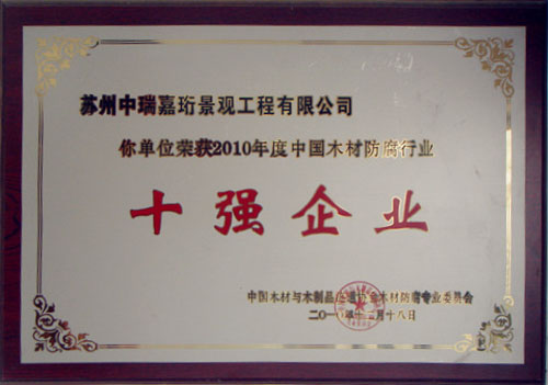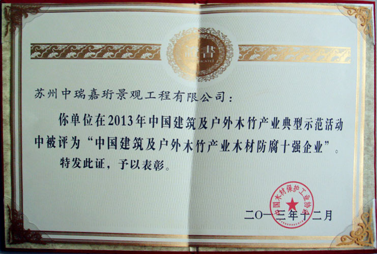 2013年在《中國木材保護工業(yè)協(xié)會》的組織下,我公司榮獲本年度防腐木企業(yè)評選《防腐木材企業(yè)十強》稱號。